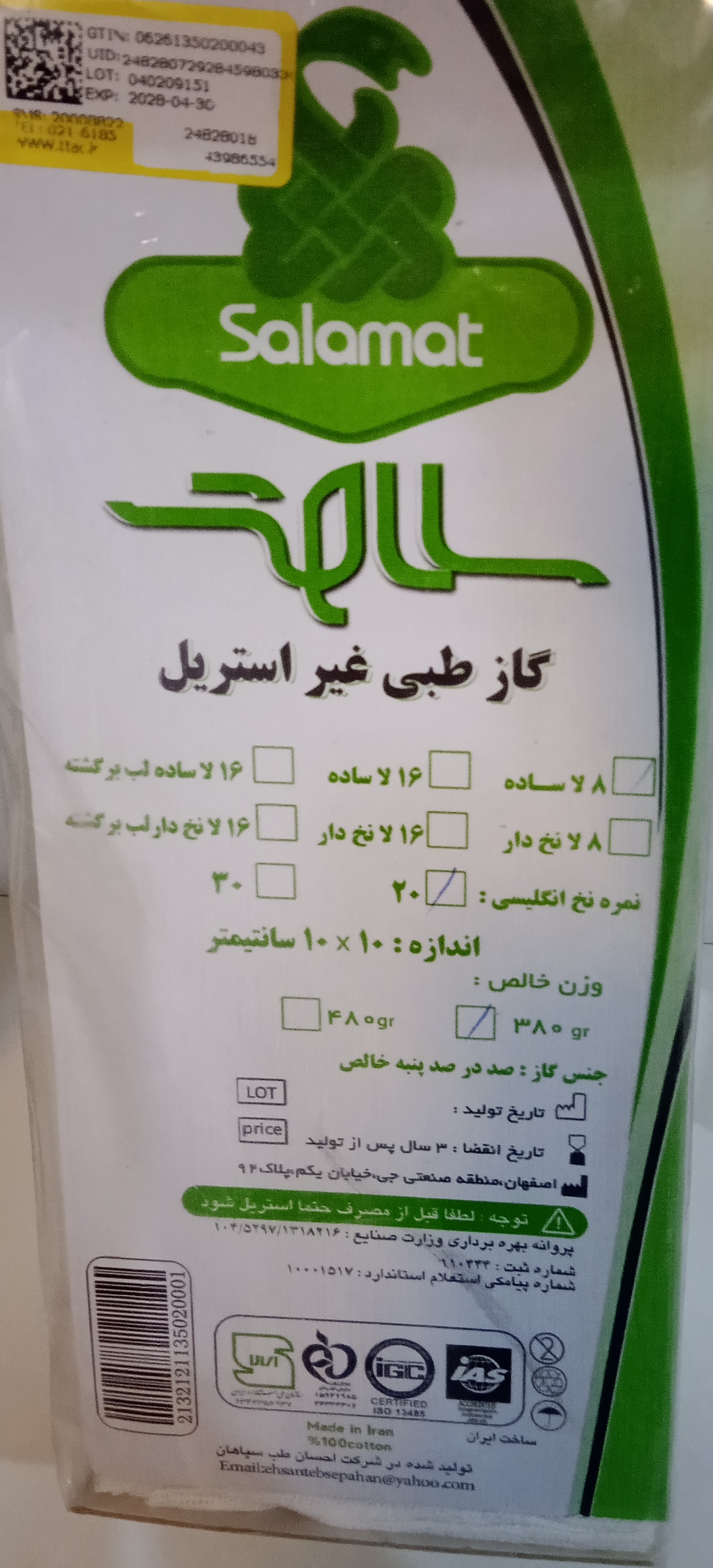 ناموجودگاز غیر استریل۳۸۰ گرمی سلامت ۸ لایه ساده